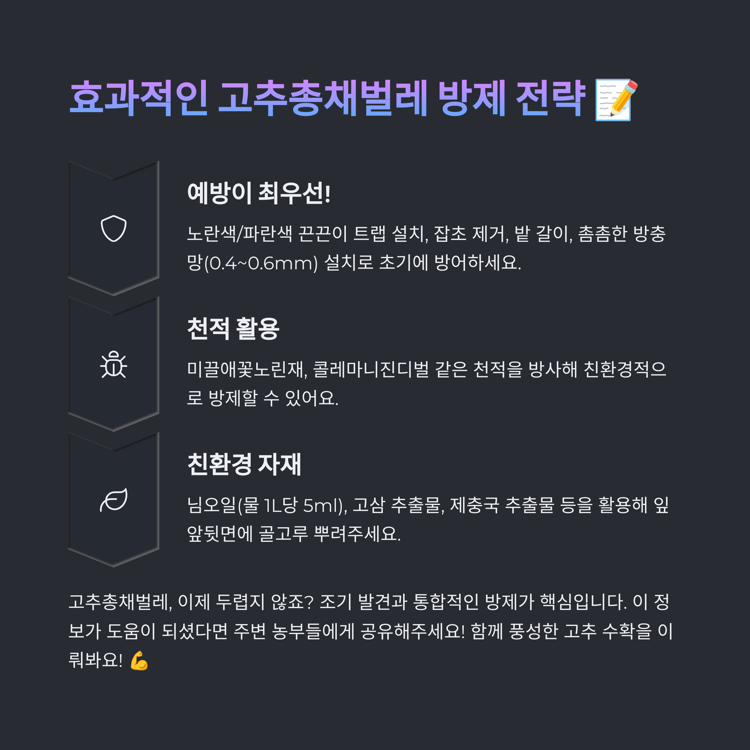 - ✅ 작물 잔재물 처리: 수확이 끝난 후에는 밭에 남아있는 고추 잔재물을 깨끗이 치워 월동하는 해충 밀도를 줄여야 합니다.