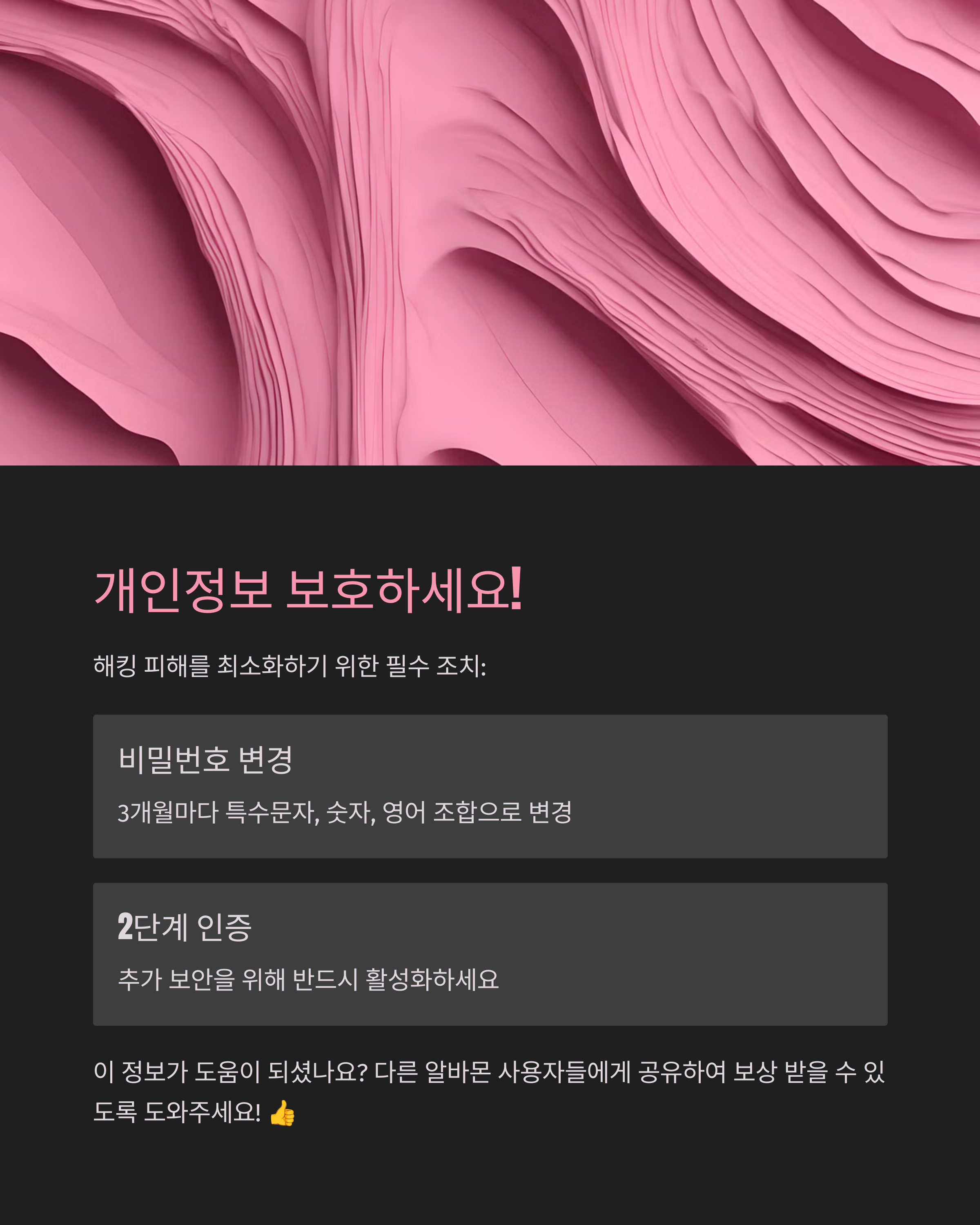 - 비밀번호는 주기적으로 변경하기: 특히 중요한 사이트들은 3개월에 한 번씩이라도 꼭 바꿔주세요! 특수문자, 숫자, 영어를 조합해서 복잡하게 만드는 게 중요합니다.