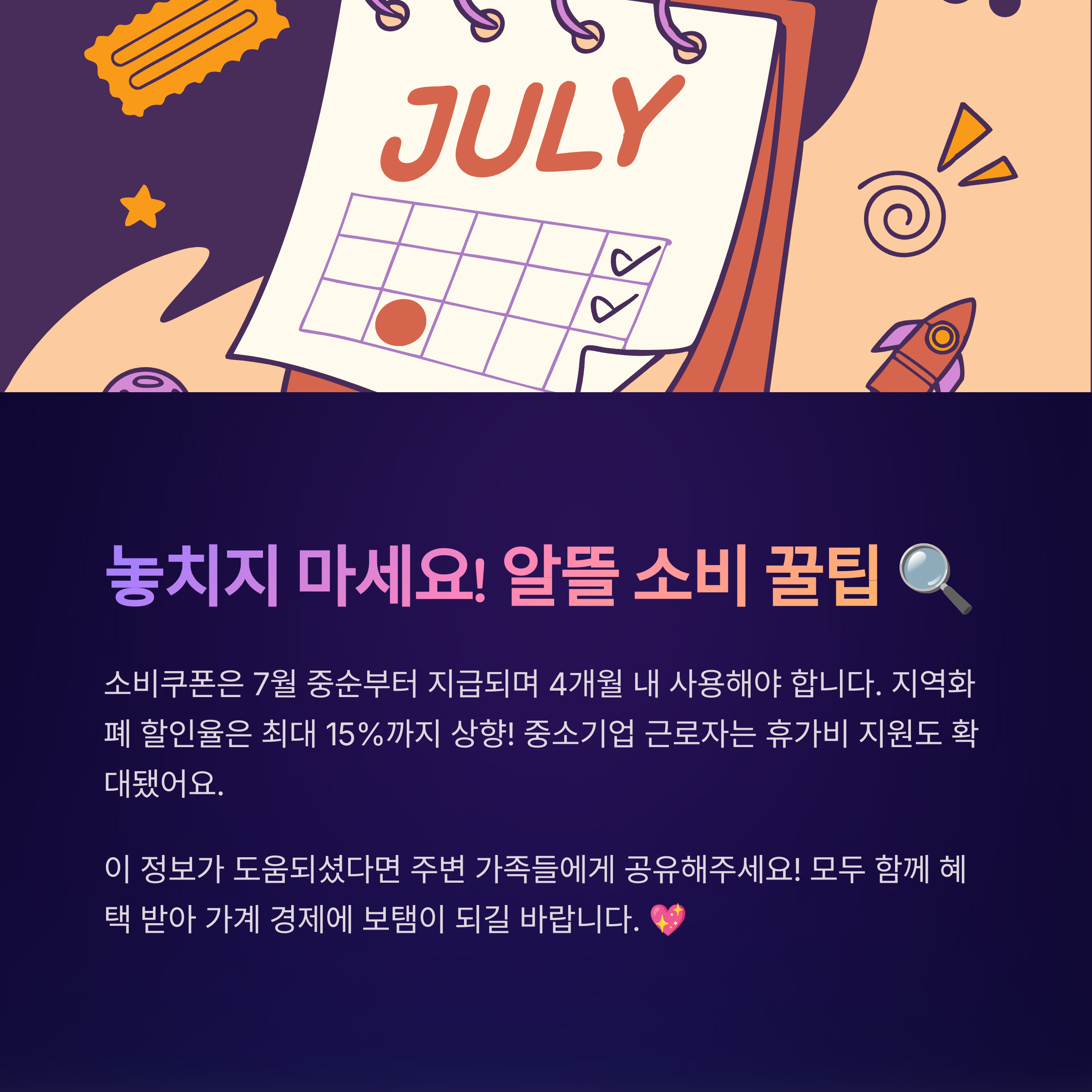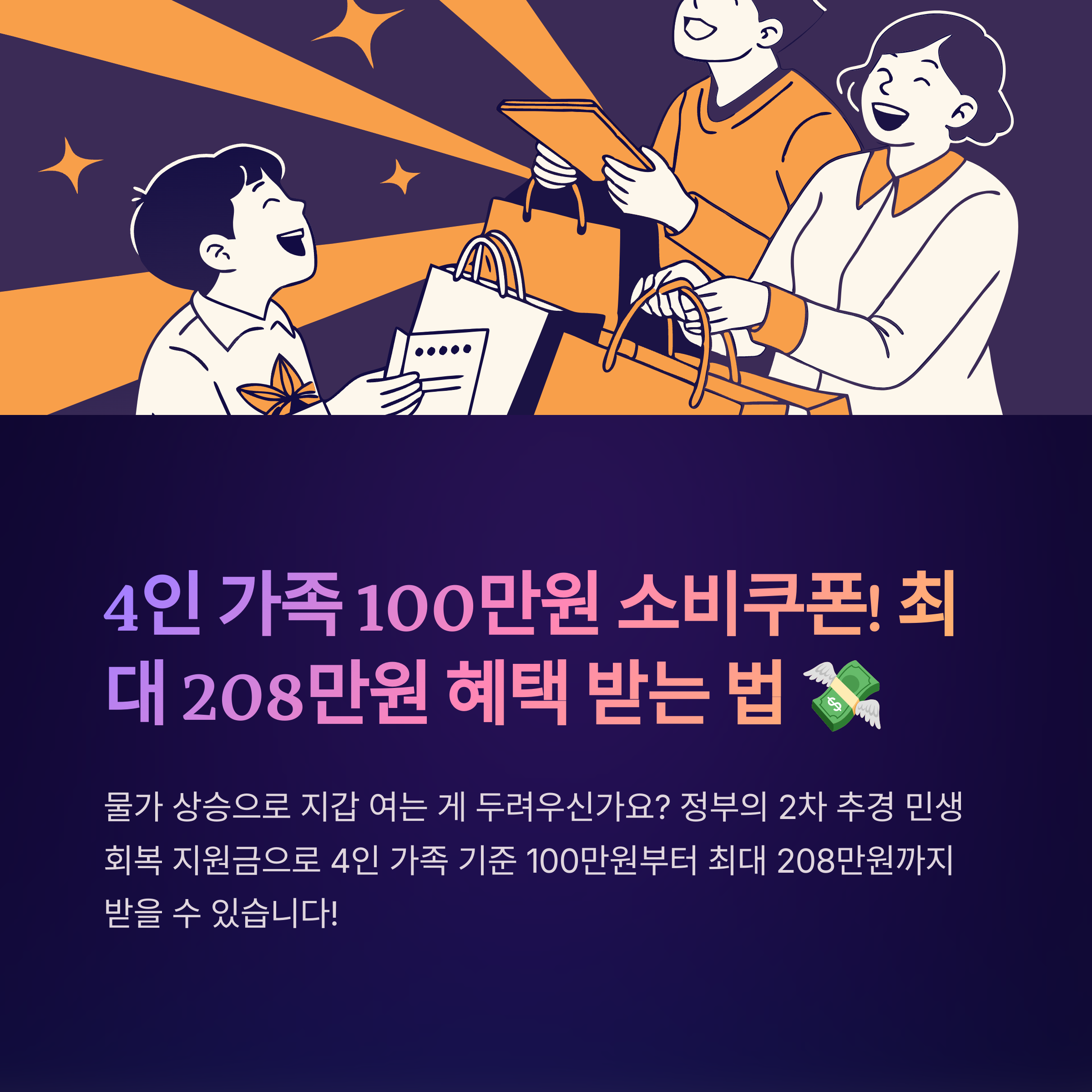 💸 4인 가족 100만원 소비쿠폰, 똑똑하게 쓰는 법은? 정부의 2차 추경 민생회복 지원금 혜택부터 고효율 가전 환급, 문화생활 할인까지! 최대 208만원까지 받을 수 있는 이 기회를 놓치지 마세요! 지금 바로 우리 가족 소비생활에 활력을 불어넣을 현명한 활용법을 알아볼까요?