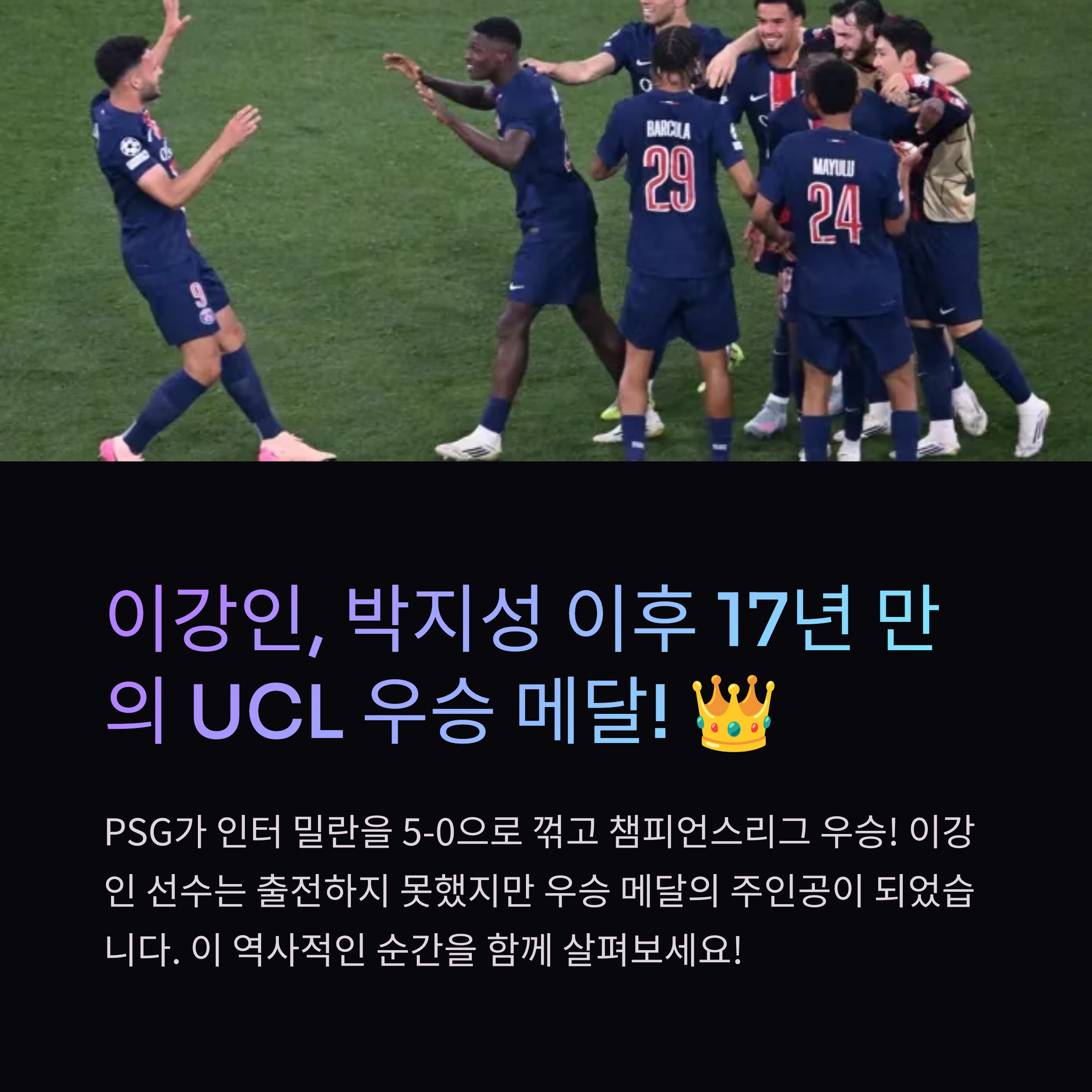 - 이강인 위업: 출전 불발에도 팀 우승으로 박지성 이후 17년 만에 UCL 우승 메달.
