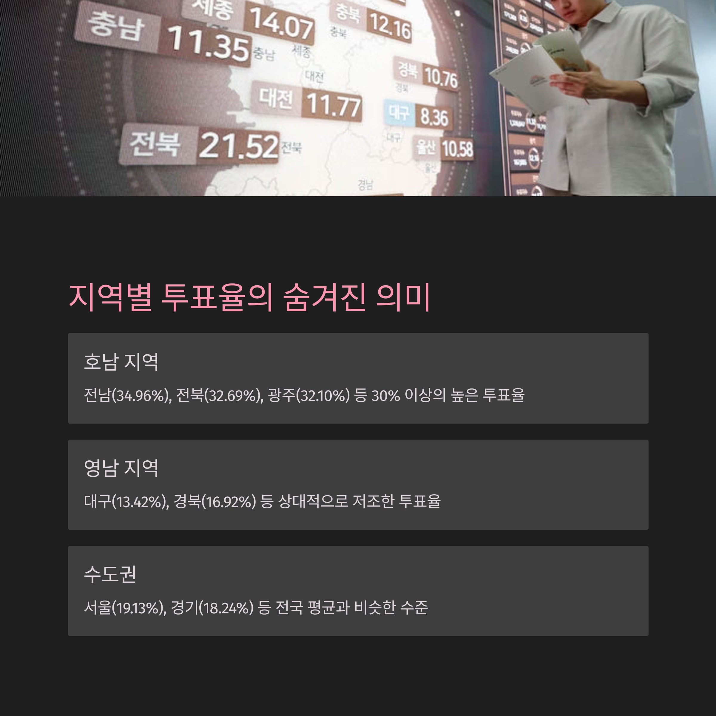 - 지역별 편차: 호남 지역은 30%를 넘는 높은 투표율을 보였고, 영남 지역은 상대적으로 낮은 투표율을 기록했어요.