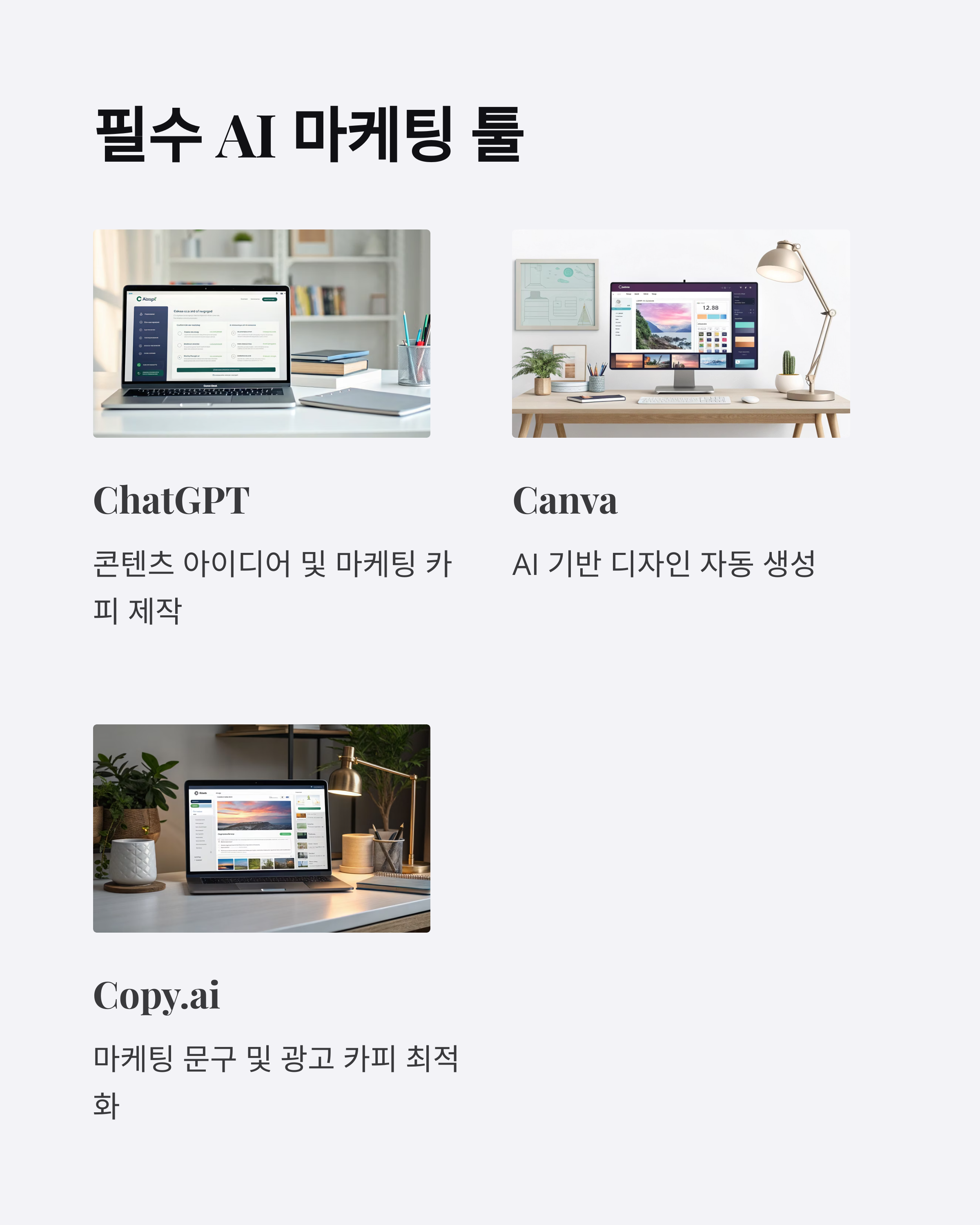| Copy.ai | 광고 문구 자동화 | 월 $36부터 | 랜딩페이지 문구 생성 |