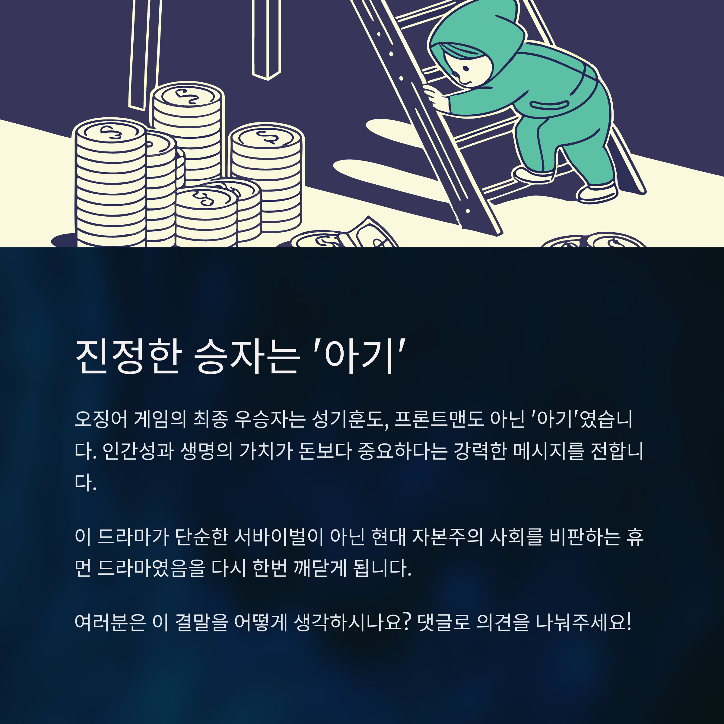 돈을 좇던 참가자들이 결국 파국을 맞이하는 동안, 생명을 지키려 했던 기훈의 신념만이 유일하게 희망을 싹 틔운 것이죠. 이 엔딩은 '오징어 게임'이 단순한 잔인한 게임이 아니라, 현대 자본주의 사회를 비판하고 인간의 가치를 되묻는 휴먼 드라마였음을 다시 한번 각인시켜 주었습니다.