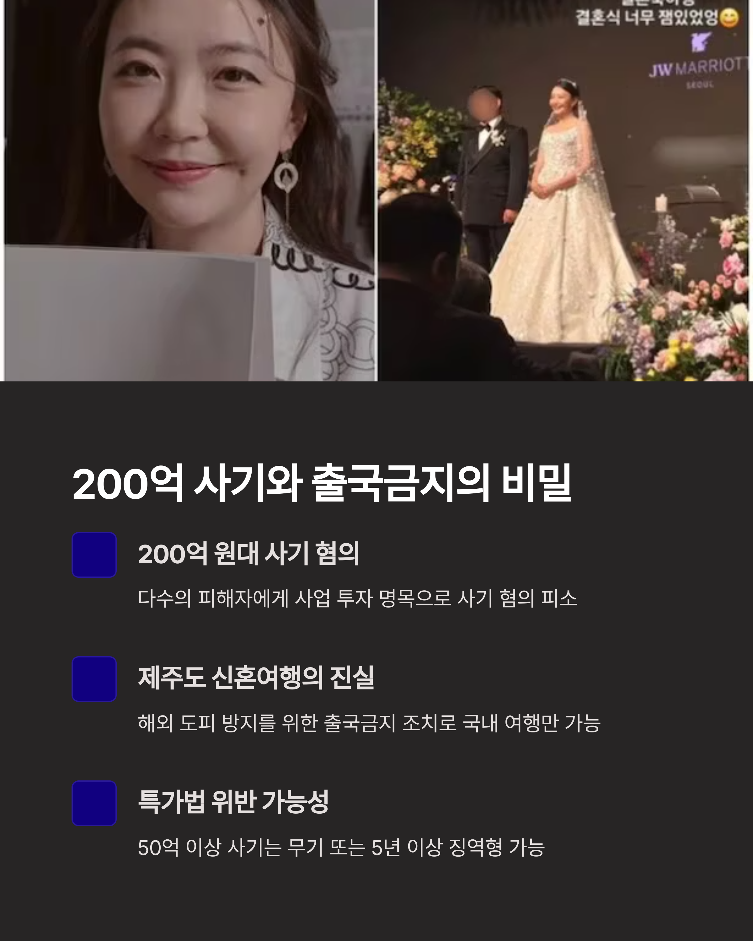 - 출국금지 조치: 사기 혐의로 피소된 후 해외 도피를 막기 위해 출국금지 명령이 내려졌고, 이것이 제주도 신혼여행의 배경이라는 추측이 나왔습니다.