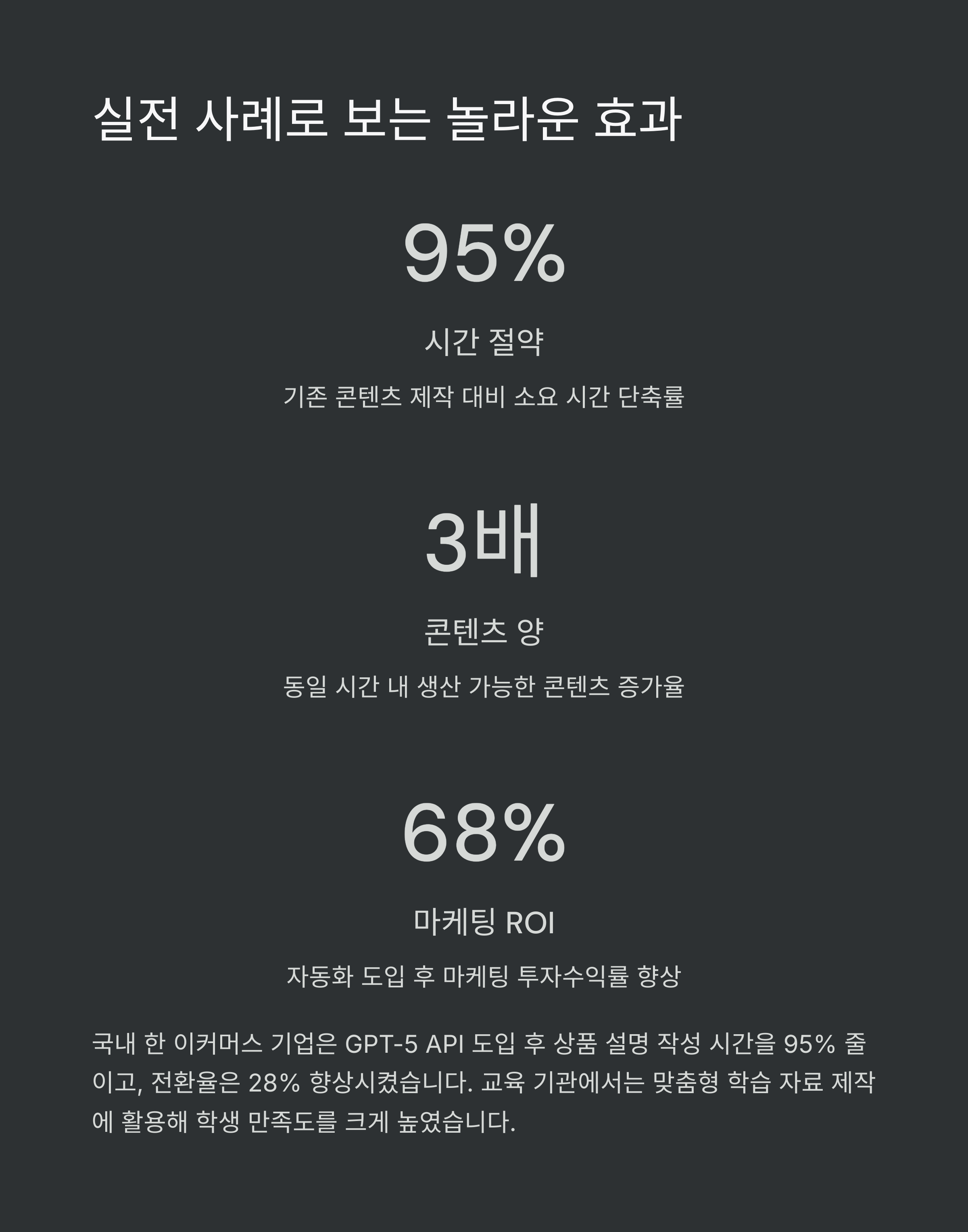 GPT-5 API를 도입하고 나서, 기업들이 가장 먼저 실감하는 건 바로 ROI(Return On Investment)입니다. 사람 손으로 하던 작업을 AI가 대신하니까, 당연히 시간과 비용이 절감되죠. 특히 마케팅 부서에서는 ‘사람 리소스’를 전략적 영역에 집중할 수 있게 됩니다.