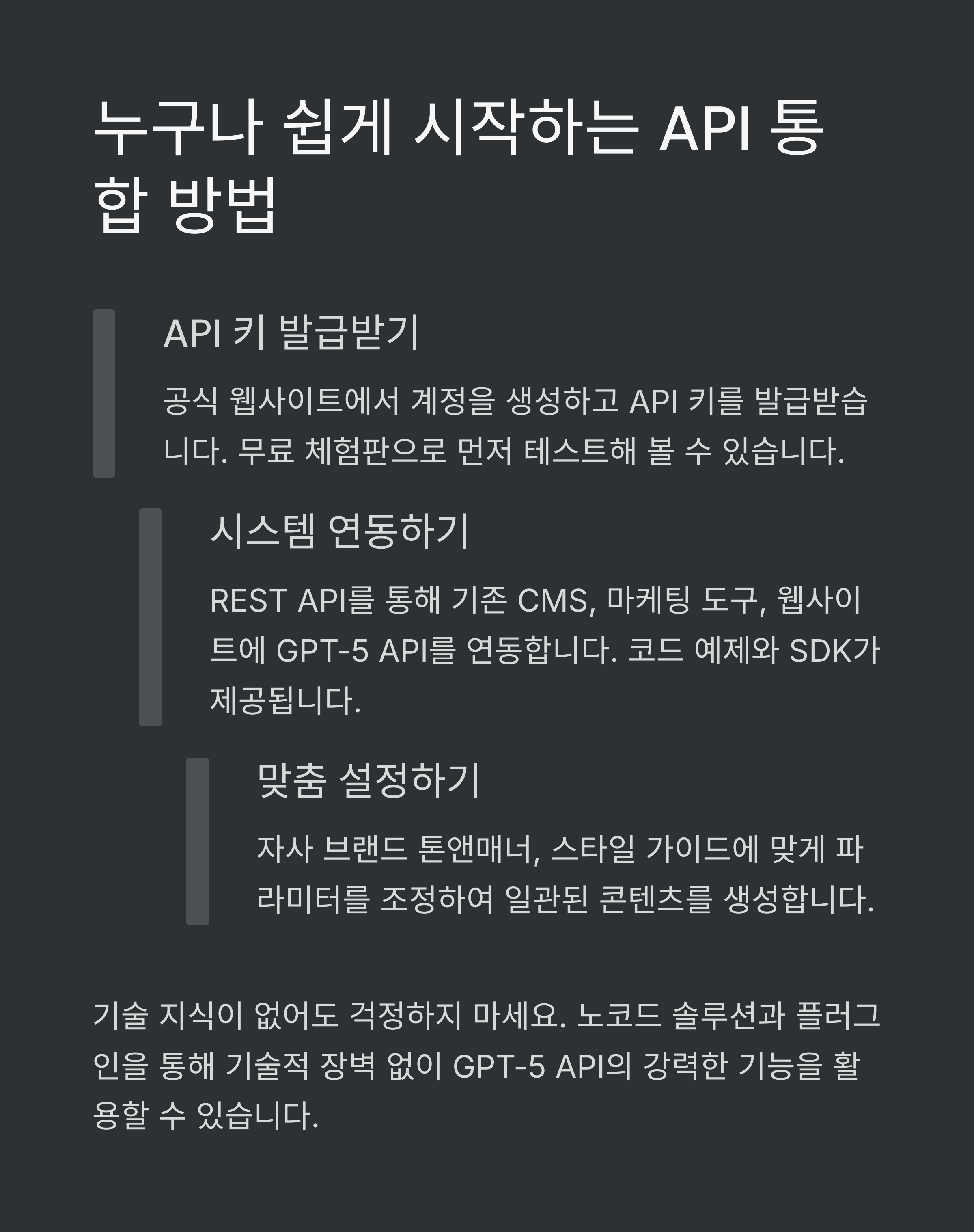 GPT-5 API를 제대로 활용하려면 몇 가지 요령이 있어요. 그냥 프롬프트 한 줄 던진다고 다 해결되진 않거든요. 특히 마케팅 콘텐츠에선 '톤앤매너'와 '키워드 최적화'가 핵심이에요.