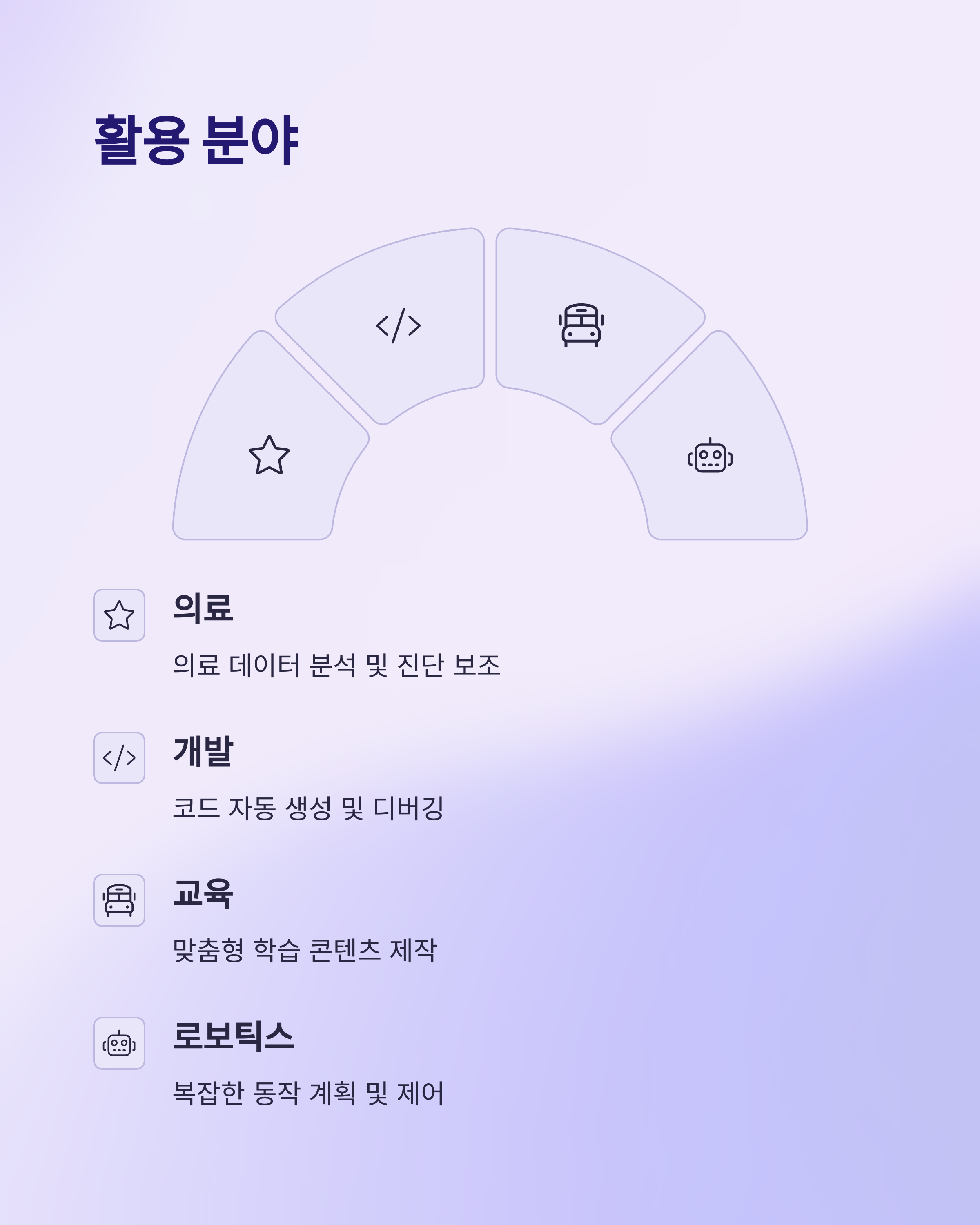 AI 비서, 의료 진단 보조, 코드 생성, 멀티미디어 콘텐츠 제작 등에서 활용도가 매우 높습니다.