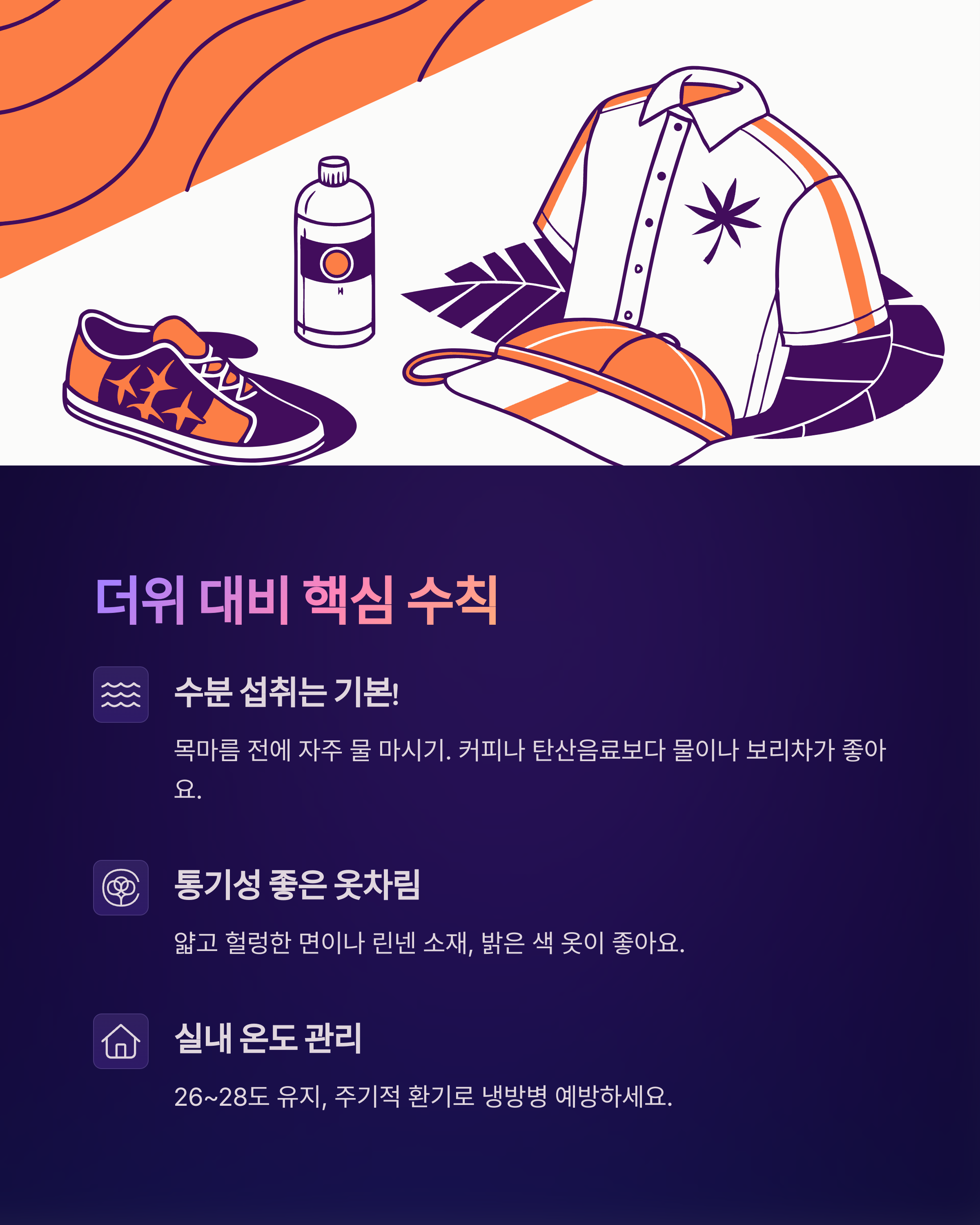 - 수분 섭취와 시원한 옷차림: 물을 자주 마시고, 가볍고 통기성 좋은 옷을 입어 체온을 조절하는 것이 가장 기본적이면서도 중요하답니다.