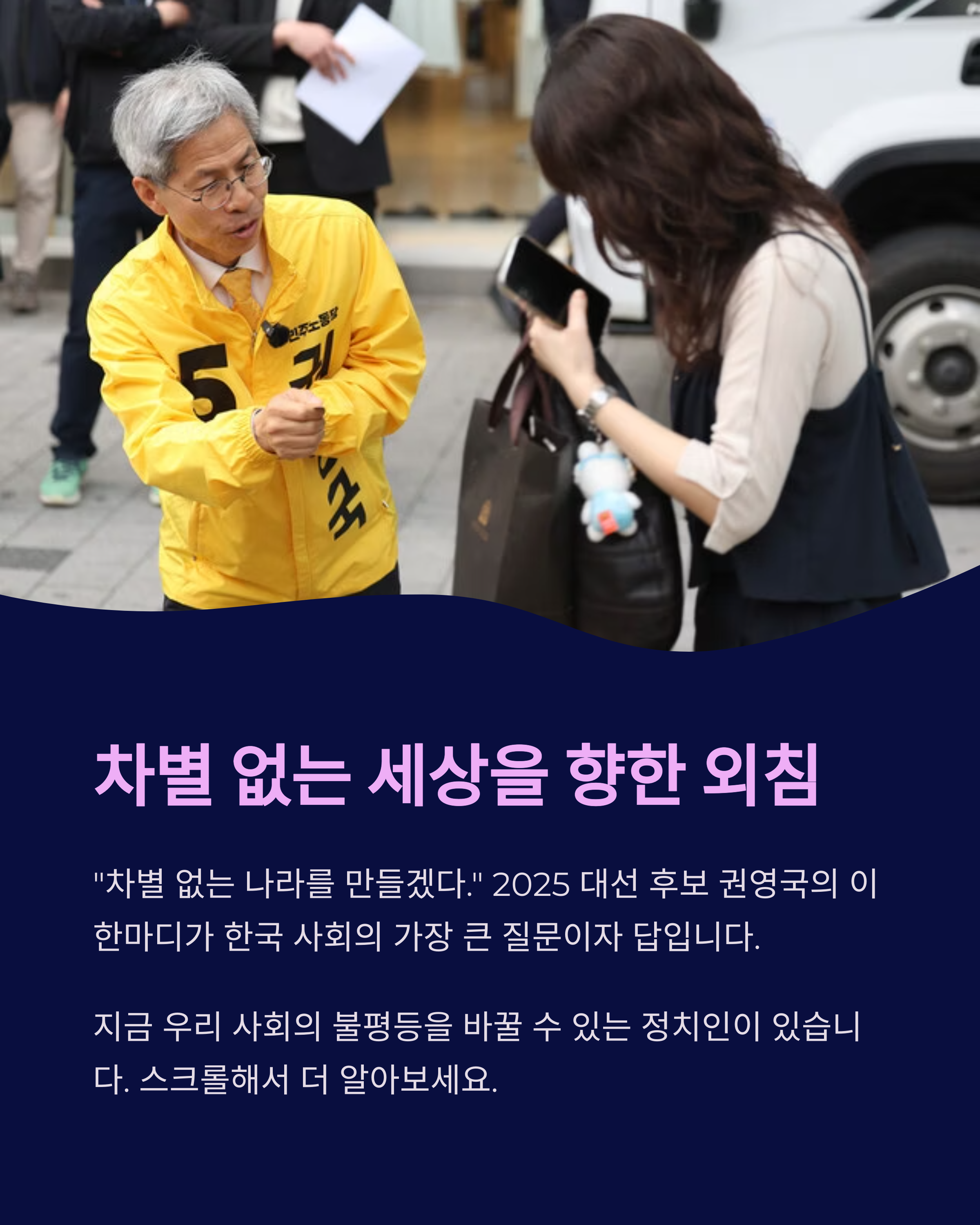 "차별 없는 나라를 만들겠다." 2025 대선 후보 권영국이 외친 이 말 한마디가 지금 한국 사회의 가장 큰 질문이자 답입니다.