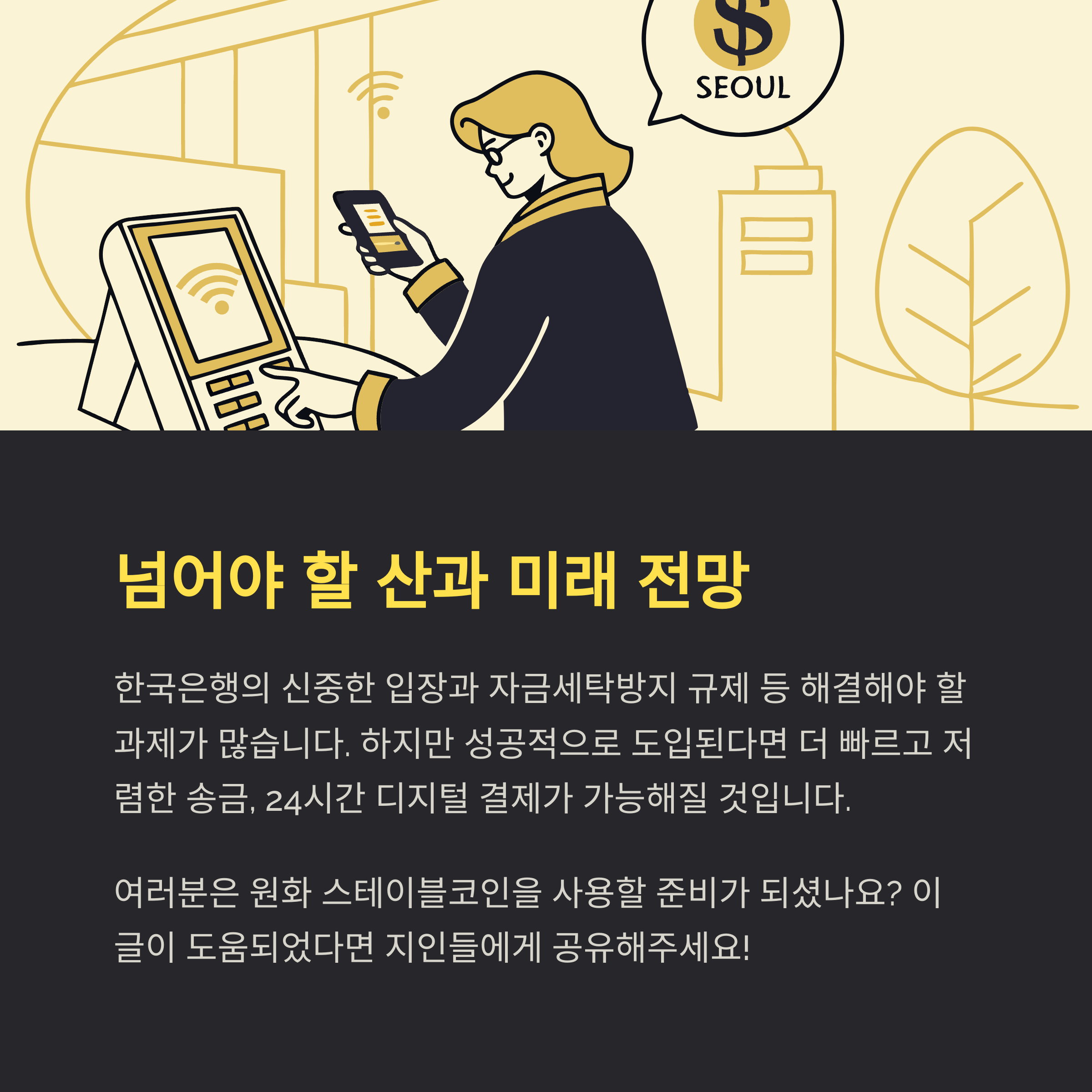 게다가 스테이블코인이 실제 서비스로 구현되려면 여러 법률을 개정해야 하고, 가상자산 관련 자금세탁방지 규제 등 해결해야 할 과제들도 산적해 있어요. 새로운 기술이 늘 그렇듯이, 이면에 숨겨진 리스크를 최소화하고 안전하게 시장을 키워나가는 지혜가 필요하다는 생각이 들어요.