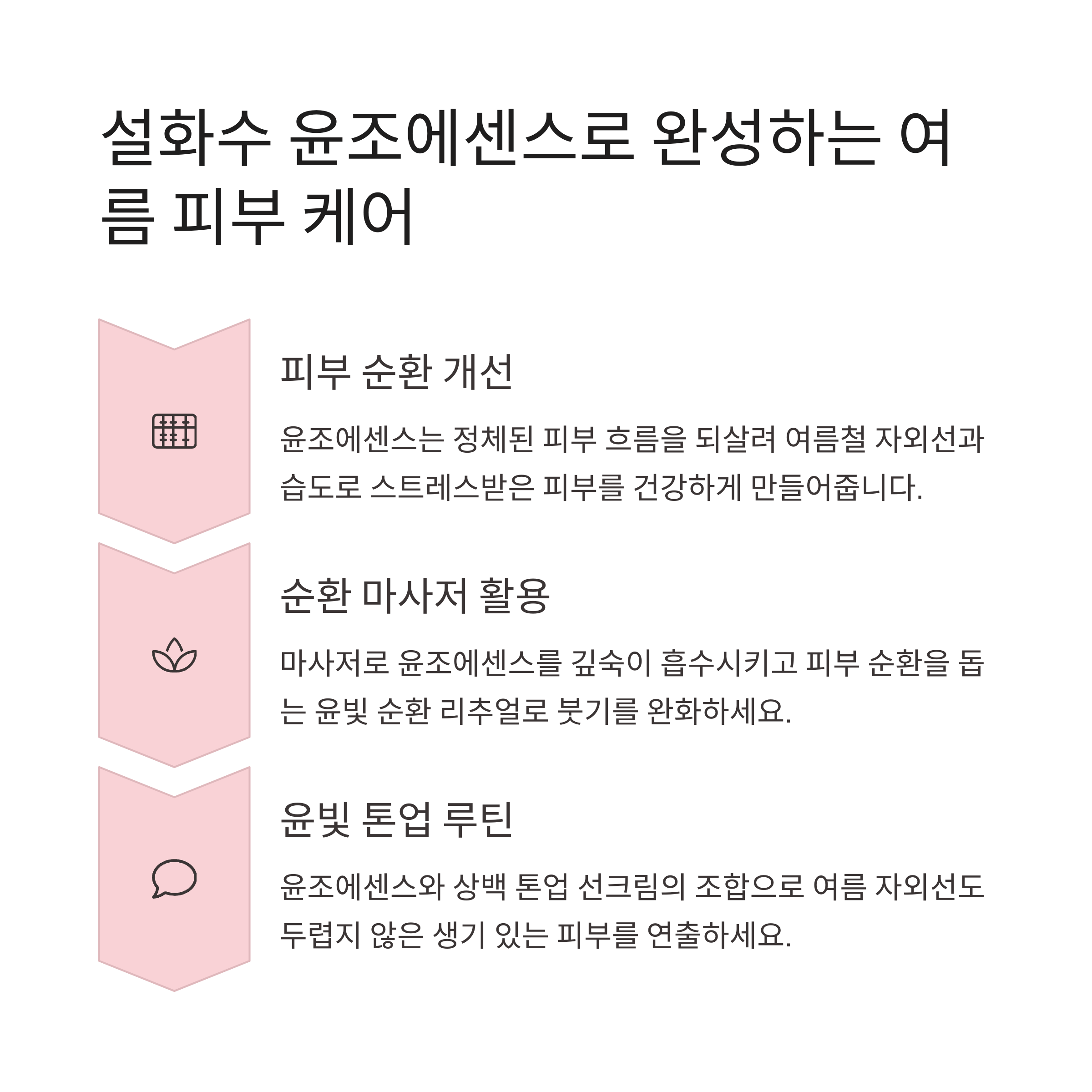- 여름 피부 고민 해결사, 설화수 윤조에센스: 강한 자외선과 습도로 지친 피부의 흐름을 되살려 타고난 듯 건강한 '윤빛' 피부로 가꿔줍니다.