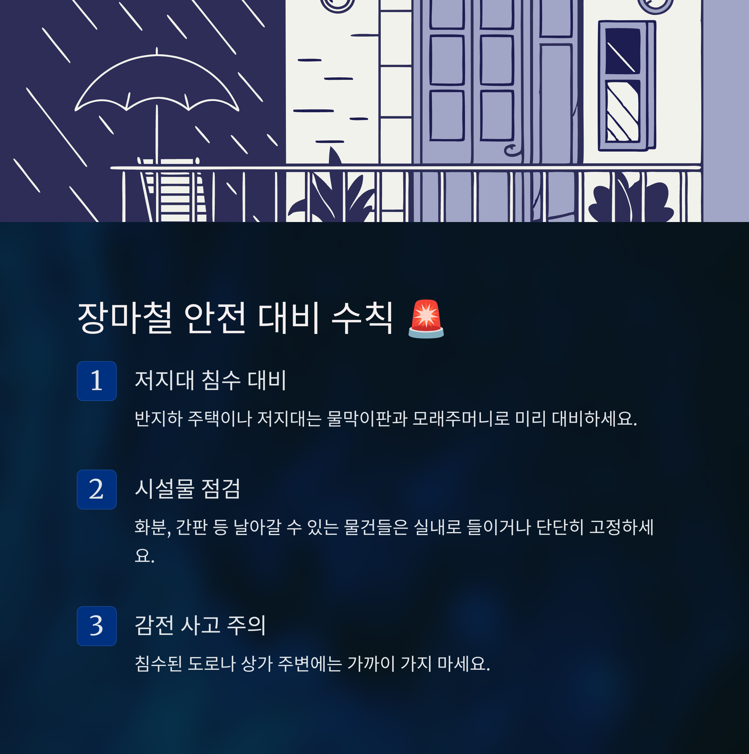 이번 장마는 전국적으로 강한 비와 함께 습한 더위를 동반하고 있어요. 안전하고 건강하게 이 시기를 보내기 위해 꼭 기억해야 할 핵심 사항들을 다시 한번 정리해드릴게요!