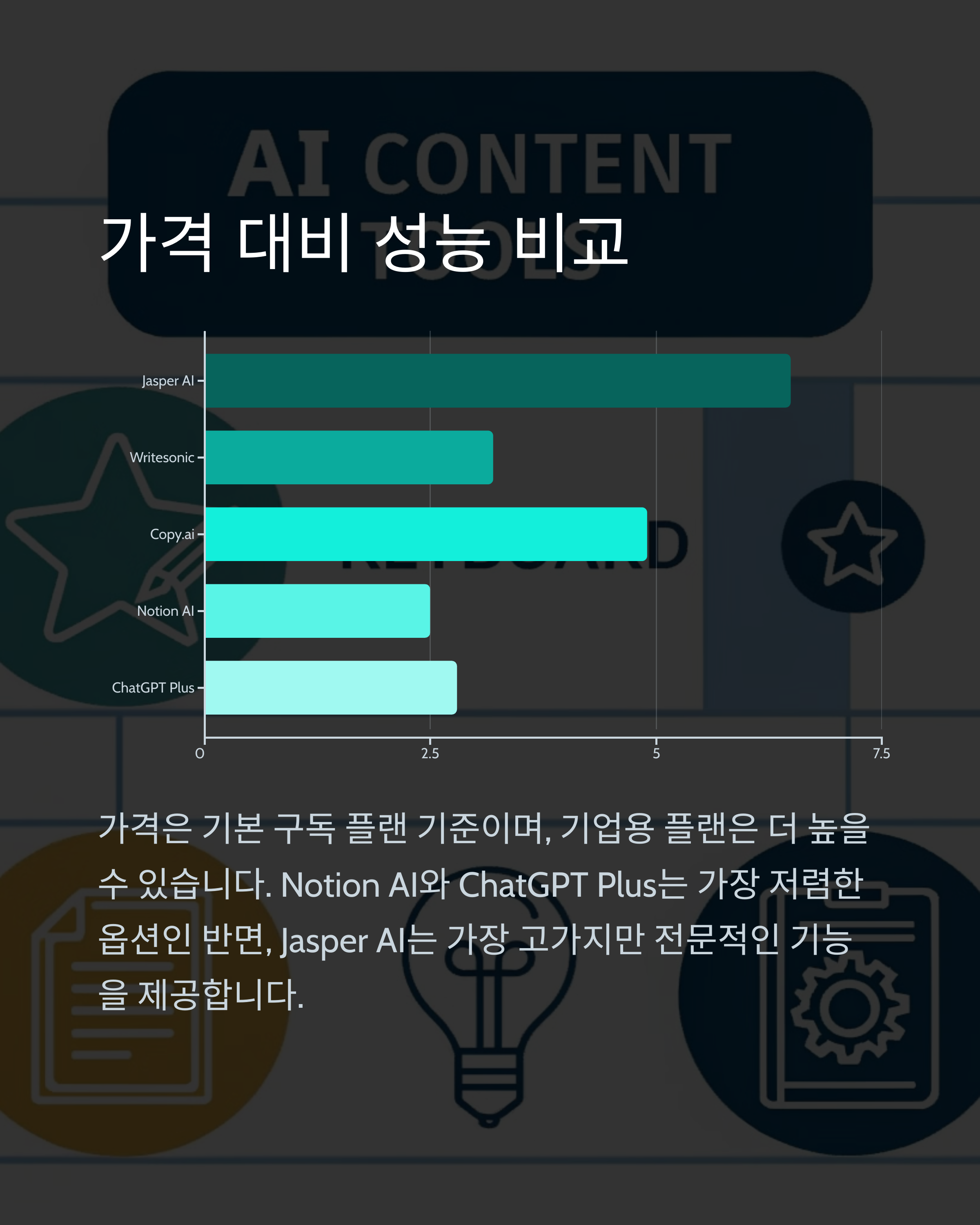 | Jasper AI | SEO에 특화된 기능, 고품질 출력 | 비싼 요금제 |