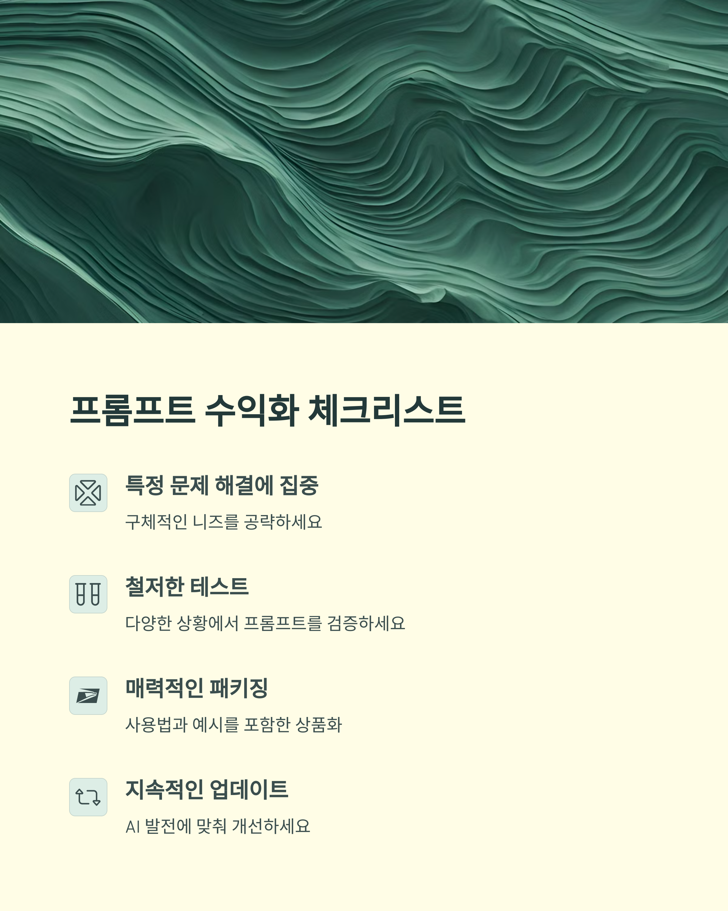 마지막으로, 수익을 창출할 수 있는 ‘잘 만든 프롬프트’의 조건을 체크리스트로 정리해드릴게요.
