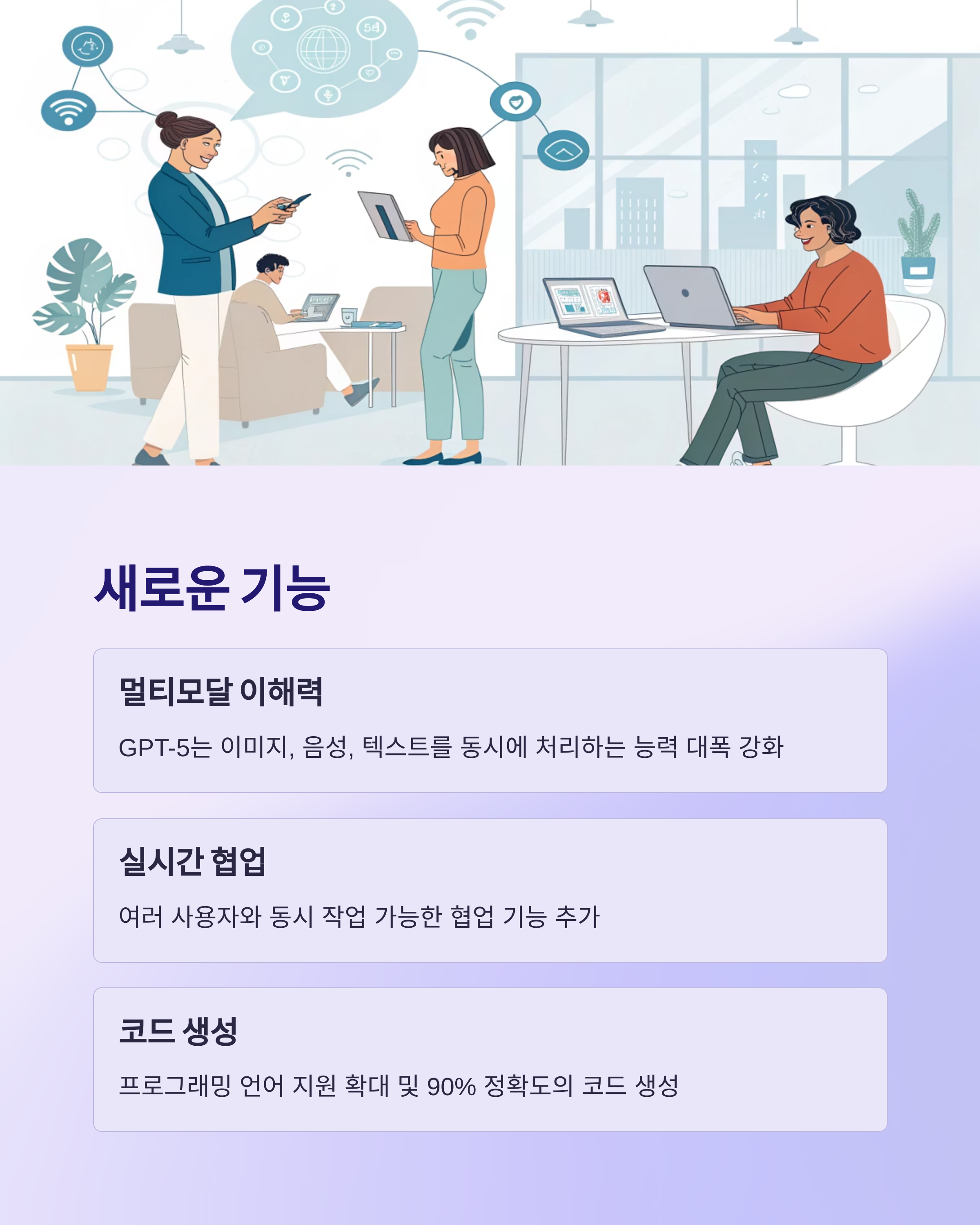 맥락 기억력과 멀티모달 처리 능력입니다. GPT-5는 텍스트 외에도 이미지와 음성 등 다양한 입력을 이해합니다.